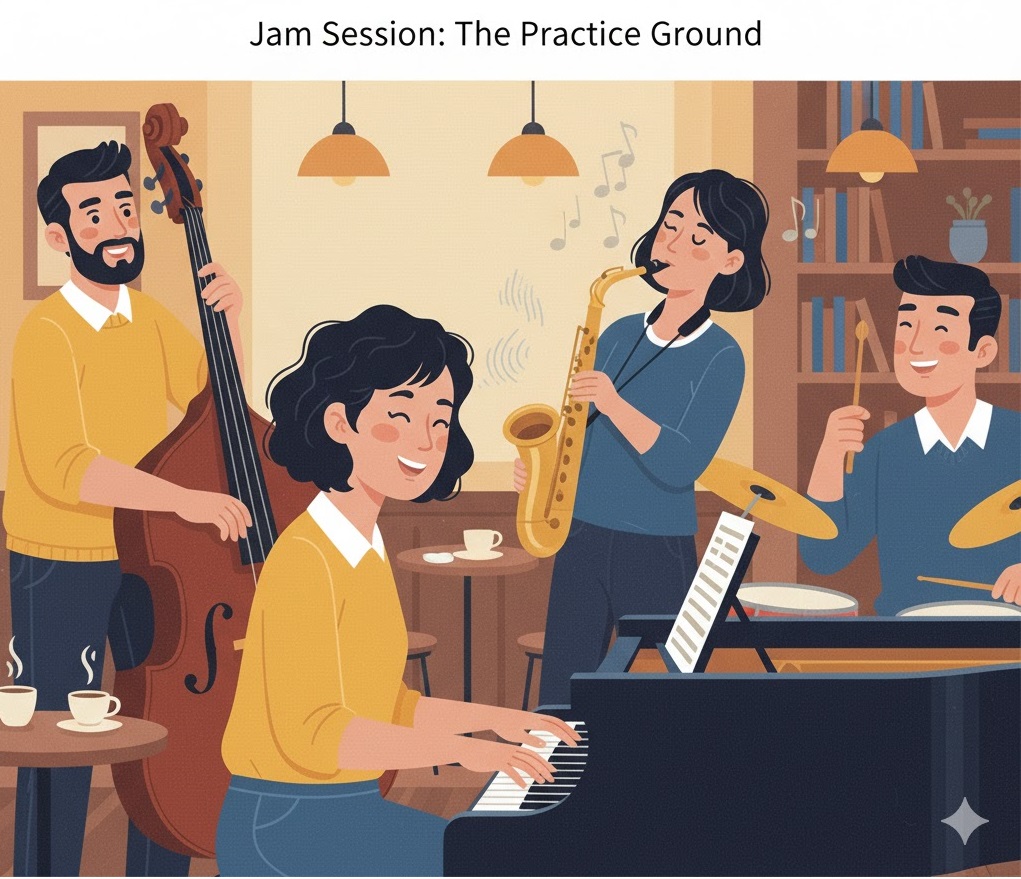 ジャズピアノの上達は、セッションに参加するのが一番の早道かもしれません。最初は1曲だけでも構いません。僕自身、最初は覚えたフレーズをそのまま弾くだけでした。